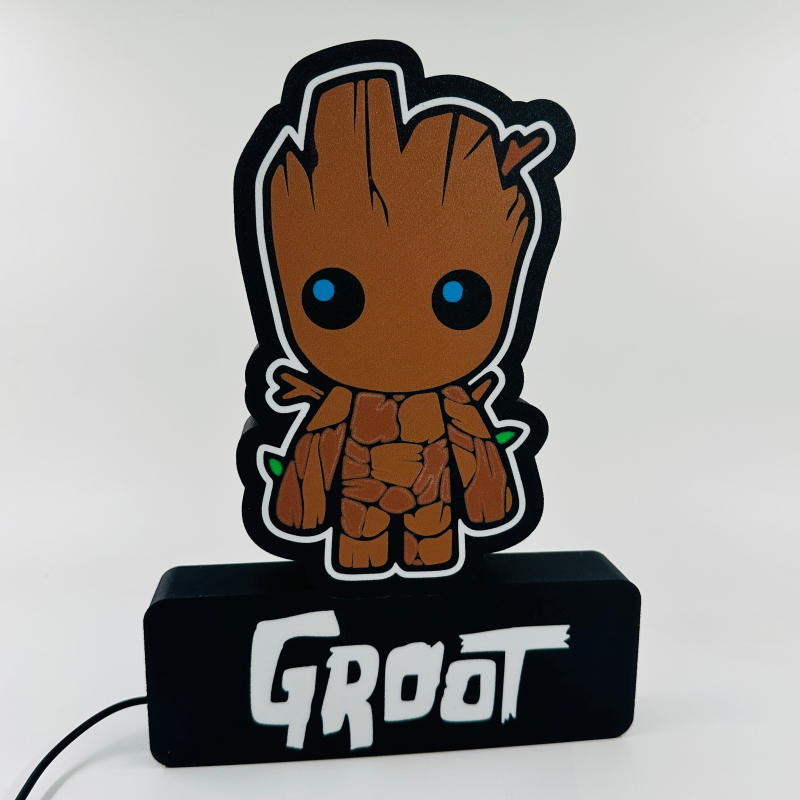 Luminaria 3d alusiva ao Groot com **** de largura, iluminada com led´s rgb, impressa em 3D com plástico PLA biodegradável. Todas as iluminarias são feitas por encomenda, sendo o prazo de entrega 10 dias após pagamento.