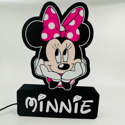 Luminaria 3d alusiva a Minnie com **** de largura, iluminada com led´s rgb, impressa em 3D com plástico PLA biodegradável. Todas as iluminarias são feitas por encomenda, sendo o prazo de entrega 10 dias após pagamento.